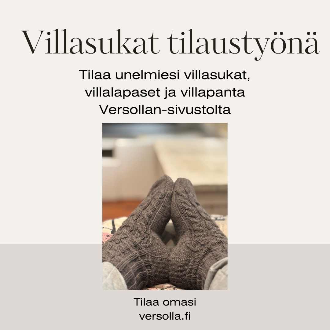 Lisäksi neulon tilauksesta käsinneulotut villasukat, villalapaset ja neulepannat toiveidesi mukaan. Poispuikoiltaan tarjoaa inspiraatiota, rauhallista tekemistä ja käytännöllisiä ohjeita arkeen – sekä ilmaisia että ladattavia PDF-neuleohjeita. Blogi on osa Versollaa, jossa yhdistyvät neulominen, luovuus ja lempeä arki. Jos etsit selkeitä suomenkielisiä neuleohjeita, helppoja neulontamalleja ja käsinneulottuja tuotteita tilauksesta, olet oikeassa paikassa.