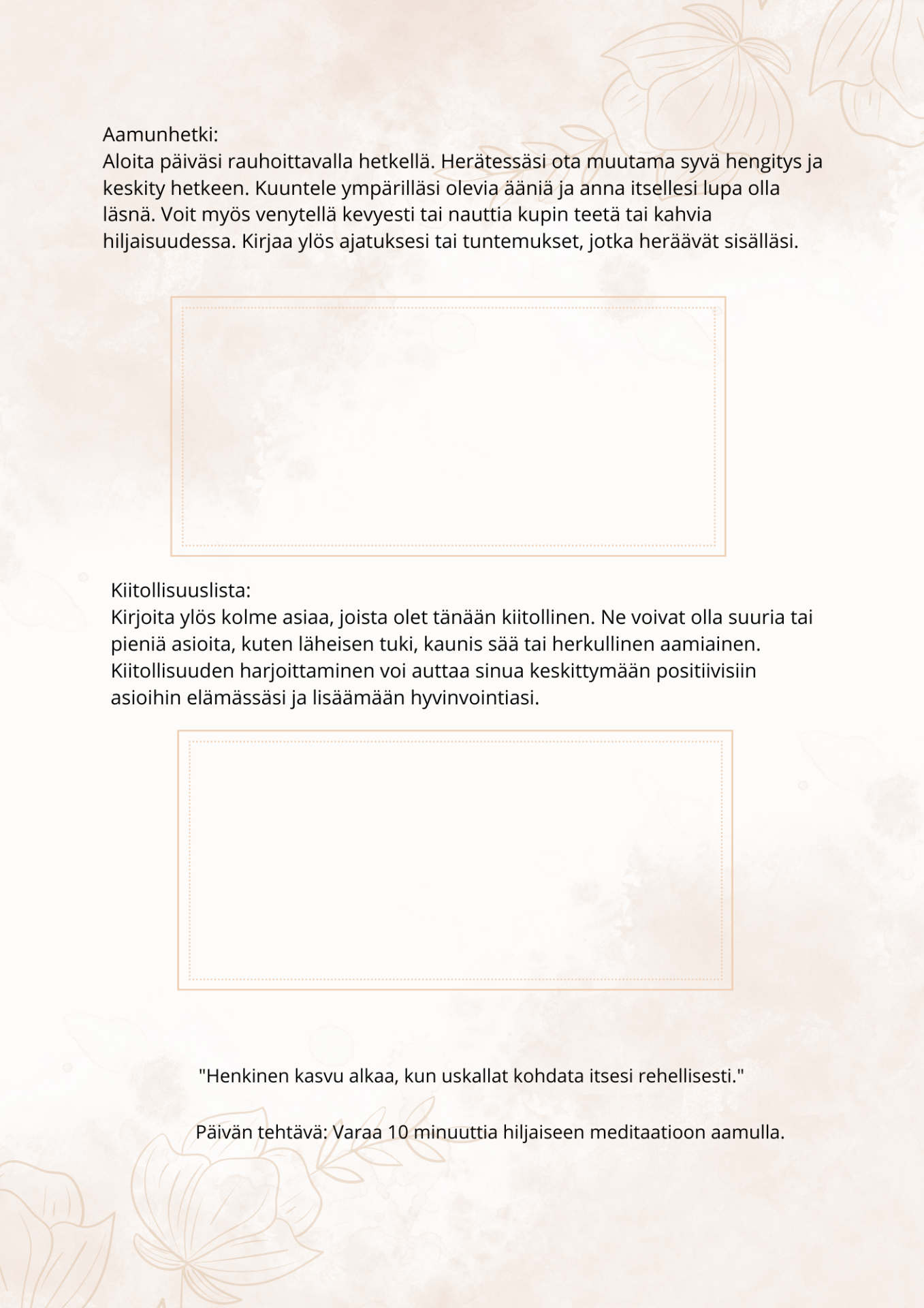 Tämä 30 päivän päiväkirja on enemmän kuin vain muistikirja – se on henkilökohtainen pysähdyspaikka, jossa voit hengittää syvään ja kohdata itsesi hetki kerrallaan. Päiväkirjan monipuoliset tehtävät tukevat mielen hyvinvointia ja sisäistä rauhaa.