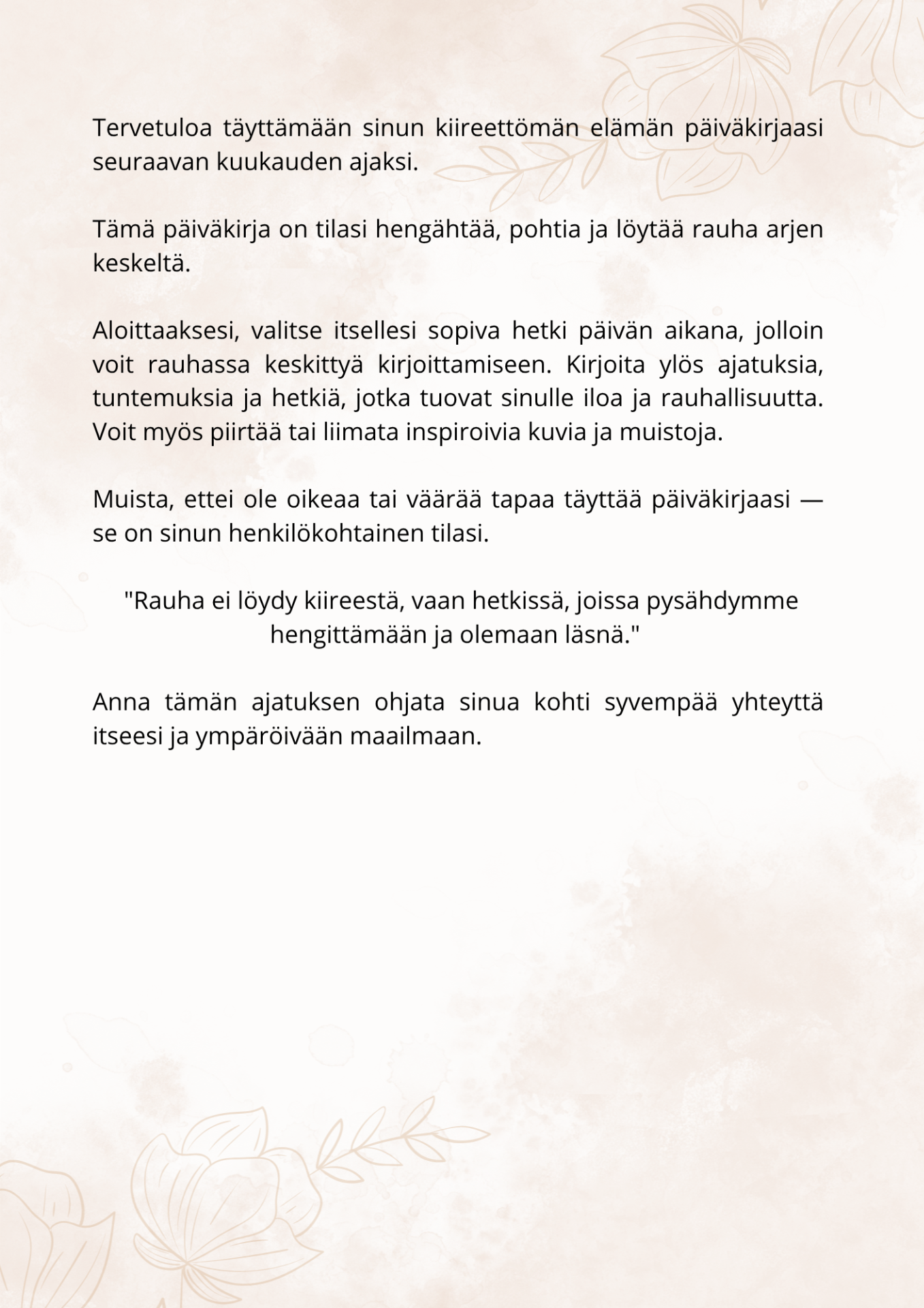 Kiireettömän elämän päiväkirja on lempeä opas sinulle, joka kaipaat irtiottoa arjen kiireestä ja haluat rakentaa tasapainoisempaa, tietoisempaa elämää pienin askelin.