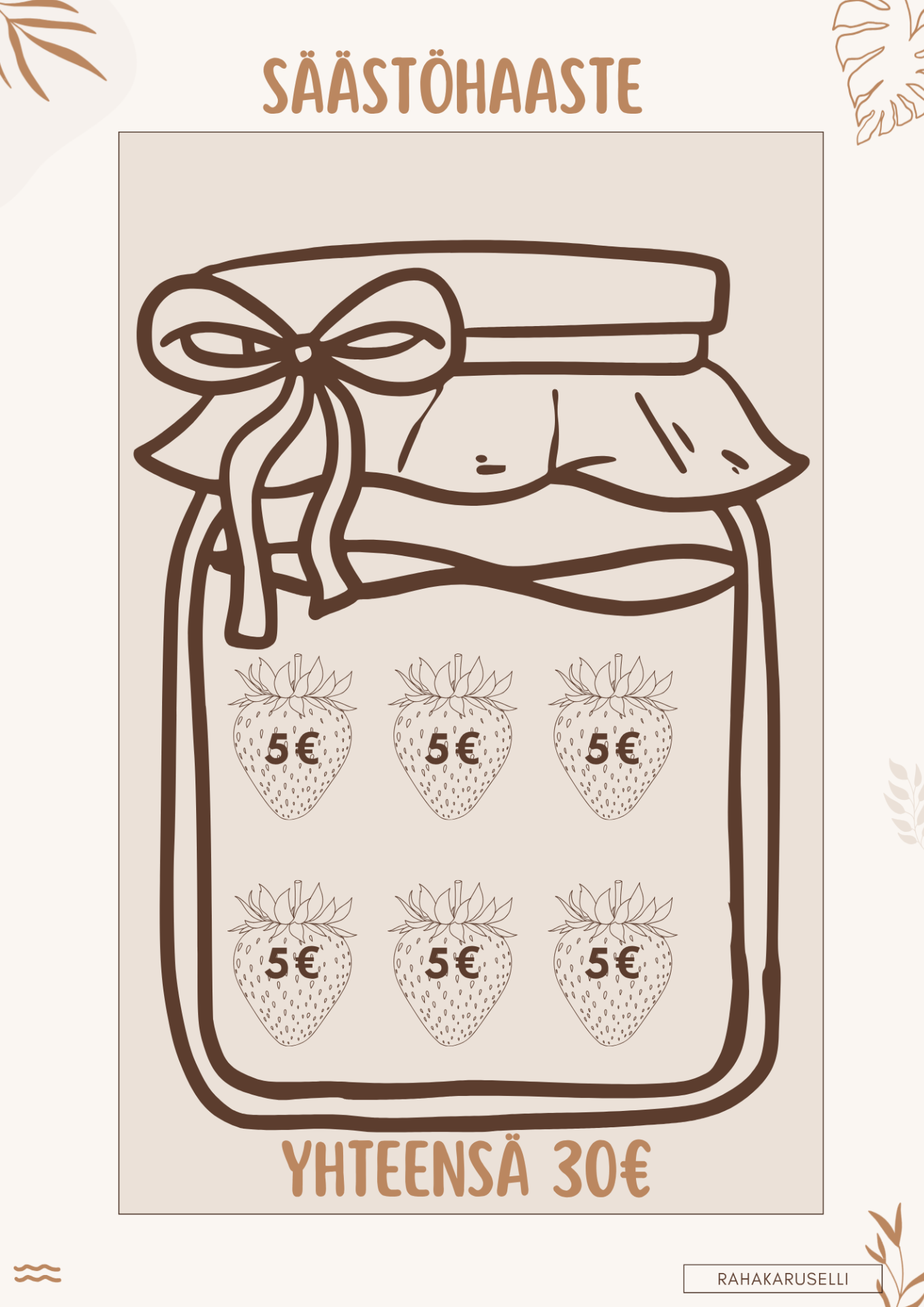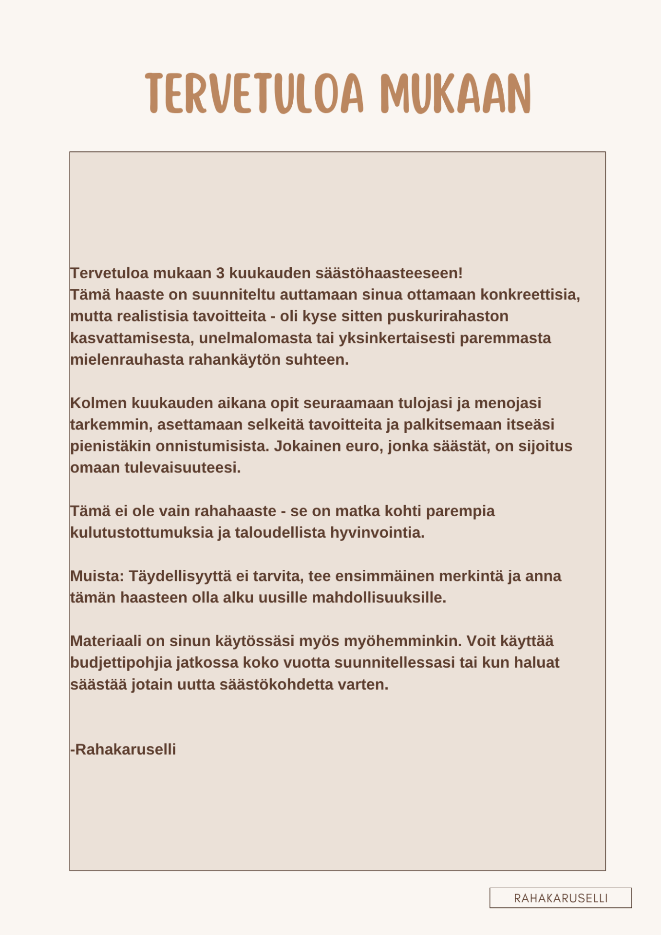 Aloita matkasi kohti taloudellista vapautta tämän inspiroivan 3 kuukauden säästöhaasteen avulla! Olitpa sitten aloitteleva säästäjä tai jo kokeneempi rahanhallinnan taitaja, tämä tulostettava PDF-säästökirja auttaa sinua saavuttamaan tavoitteesi askel kerrallaan - helposti, visuaalisesti ja motivoivasti.
