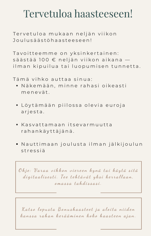 Haaste sisältää viikoittaiset tehtävät, säästövinkkejä ja bonusmateriaalia, joiden avulla pienet arjen valinnat kertyvät nopeasti merkittäväksi säästöksi. Opit hyödyntämään kaapistasi löytyviä resursseja, karsimaan turhia menoja ja suunnittelemaan joulun kulut fiksusti.