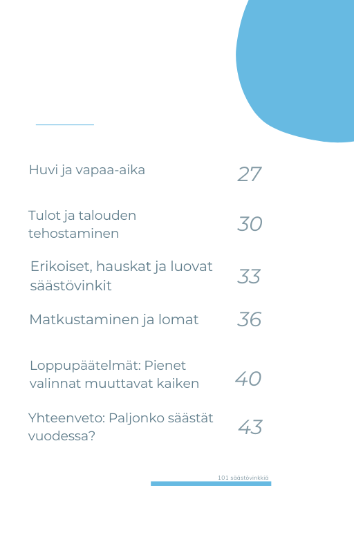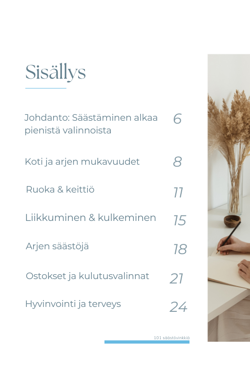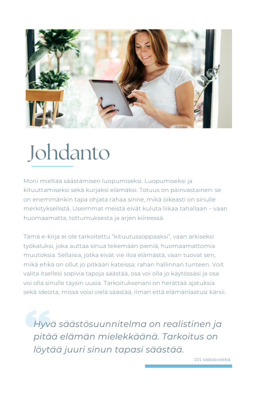 101 Säästövinkkiä on käytännöllinen ja inspiroiva e-kirja, joka auttaa säästämään arjessa ilman kituuttamista. Saat yli sata helppoa ja toimivaa vinkkiä ruokaan, kotiin, liikkumiseen, kulutuskäyttäytymiseen ja arjen pieniin valintoihin — sellaisia, jotka oikeasti säästävät rahaa.